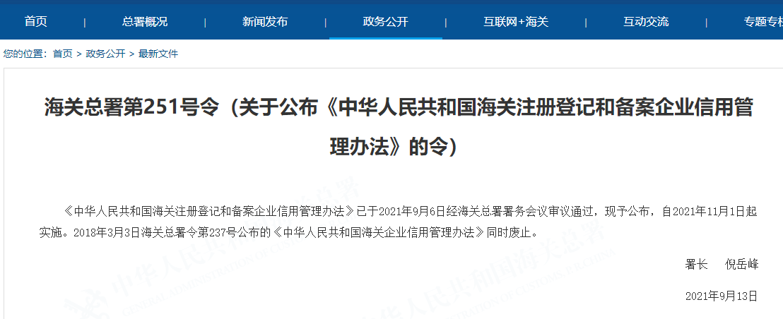 海關(guān)總署于2021年9月13日公布了《中華人民共和國(guó)海關(guān)注冊(cè)登記和備案企業(yè)信用管理辦法》(海關(guān)總署令第251號(hào),以下簡(jiǎn)稱《辦法》),將自2021年11月1日起施行。2018年3月3日海關(guān)總署令第237號(hào)公布的《中華人民共和國(guó)海關(guān)企業(yè)信用管理辦法》同時(shí)廢止。