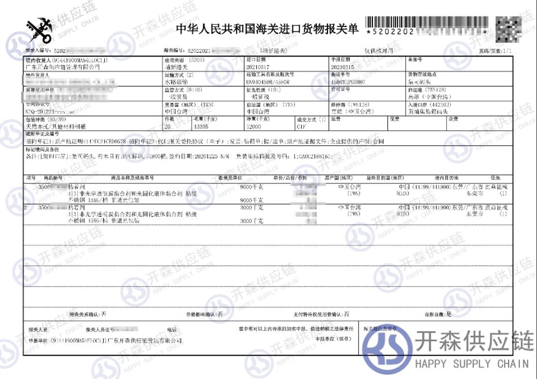 【導(dǎo)讀】您正在閱讀的是關(guān)于臺灣粘合劑進口報關(guān)清關(guān)代理服務(wù)【經(jīng)典案例】的內(nèi)容,本文由開森化工品進口報關(guān)代理小編整理編寫;