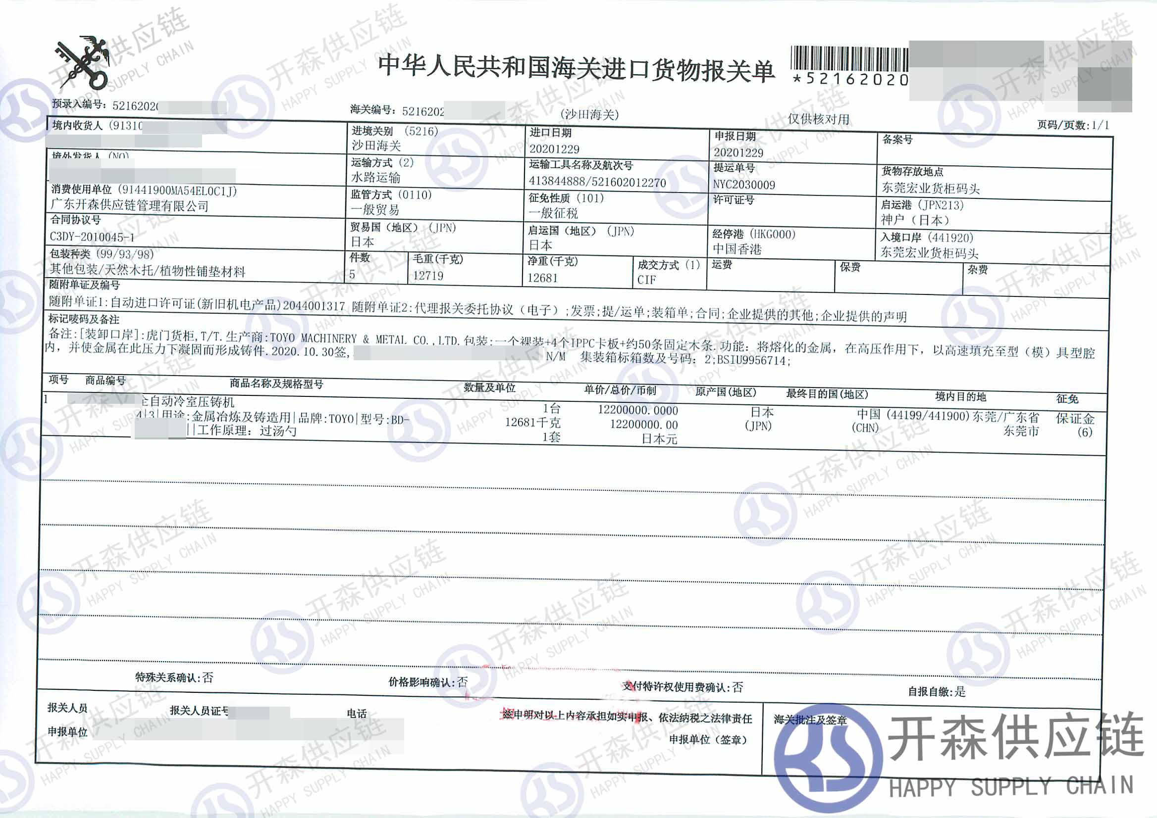 從日本進口全自動壓鑄機等到東莞碼頭,我司提供門到門進口一站式清關服務,開森擁有十余年機械設備進口清關經(jīng)驗及案例,為客戶提供量身制作的進口方案,讓客戶進口省時省心省成本。