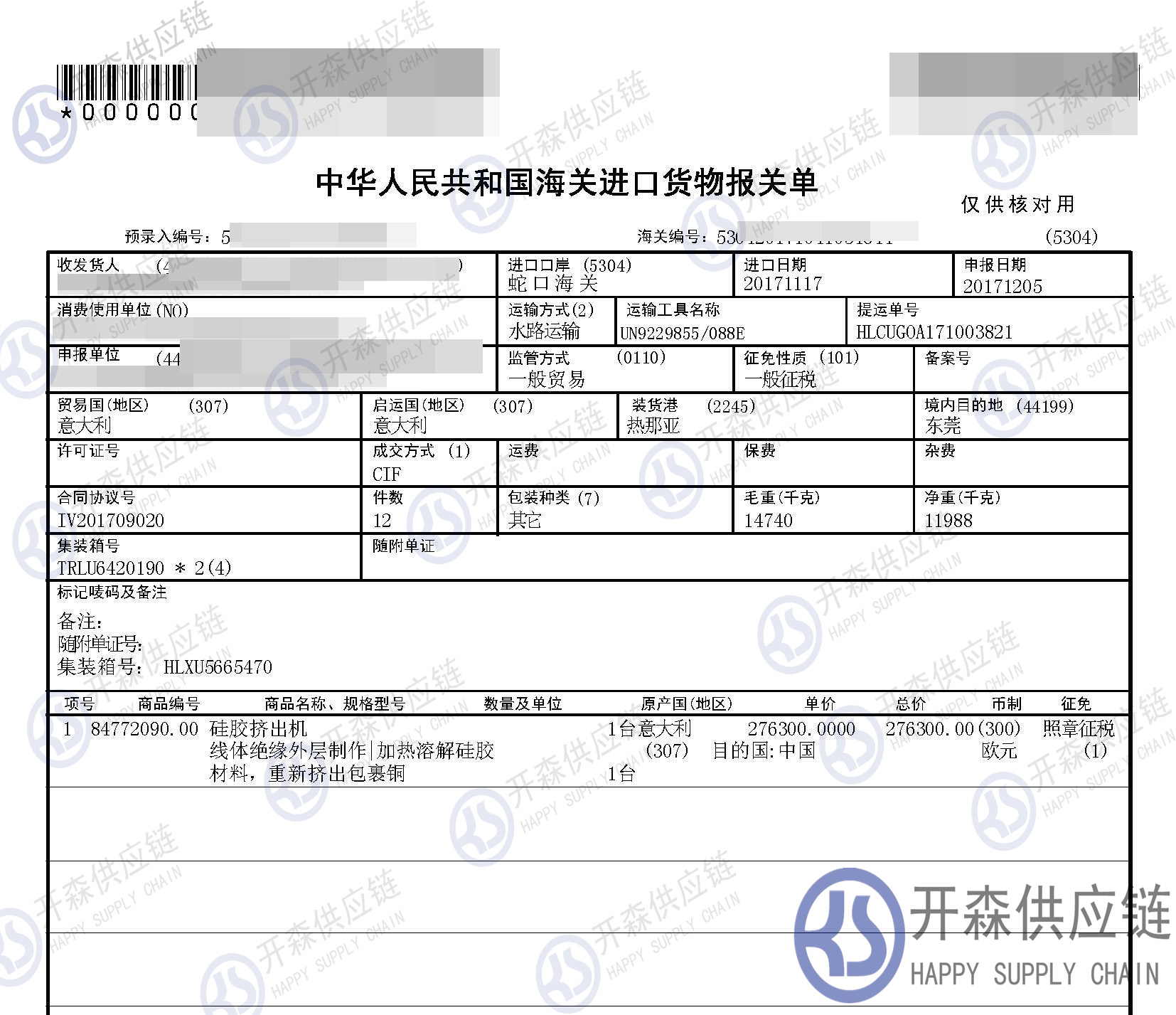 上述就是【進口案例】東莞碼頭硅膠擠出機進口報關(guān)代理服務的全部內(nèi)容,希望能對您有所幫助,如有機械進口報關(guān)上任何疑問及問題可隨時在線聯(lián)系我們或撥打 18002611553,開森供應鏈擁有豐富的機械進口報關(guān)操作經(jīng)驗及案例,10余年進口經(jīng)驗為您所用,各類進口疑難都能為您一一解答及協(xié)助快速處理解決!