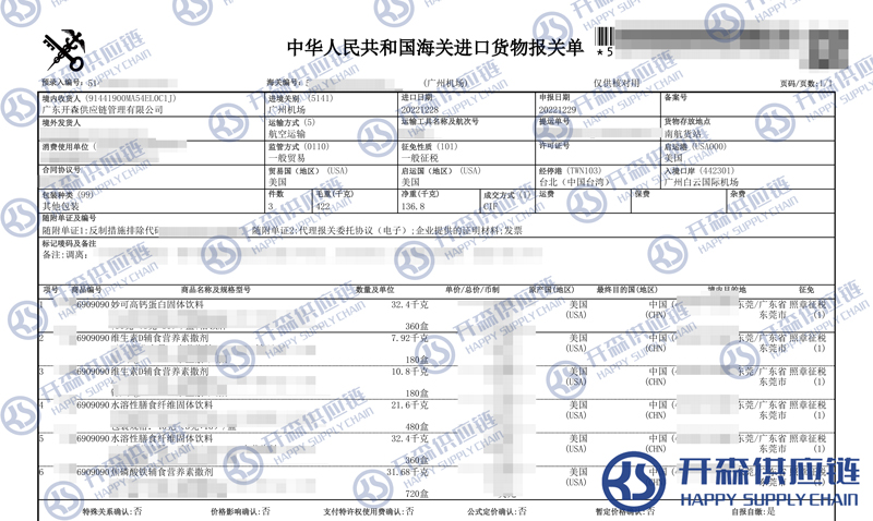 【導讀】您正在閱讀的是關于廣州機場美國固體飲料進口報關清關代理服務【經(jīng)典案例】的內(nèi)容,本文由開森固體飲料進口報關代理小編整理編寫;