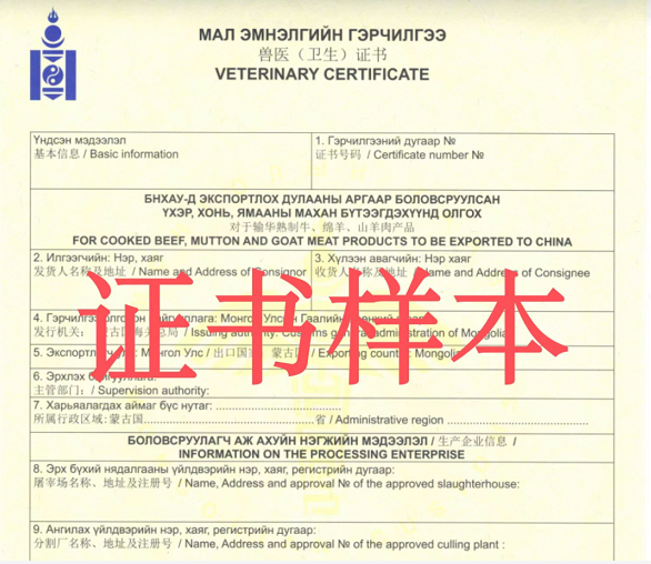 蒙古國官方已向中國海關(guān)總署備案確認蒙古國熟制牛羊肉產(chǎn)品獸醫(yī)衛(wèi)生證書樣式、官方印章及官方獸醫(yī)簽字等相關(guān)信息。進口蒙古國熟制牛羊肉產(chǎn)品應(yīng)附有蒙古國官方出具的獸醫(yī)衛(wèi)生證書,并加蓋官方印章和官方獸醫(yī)簽字,同時向中國海關(guān)推送對應(yīng)蒙古國輸華肉類衛(wèi)生證書電子信息。